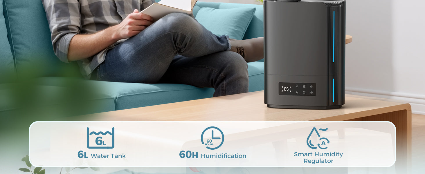 Tired of frequent refills? The 6L tank meets your humidifying needs and reduces refill times.