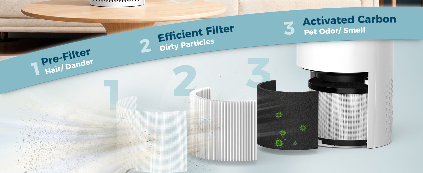 Equipped with a high-efficiency filtration system, the MK01A effectively captures airborne particles such as smoke, pollen, pet dander, and hair, helping to improve indoor air quality and support overall well-being.