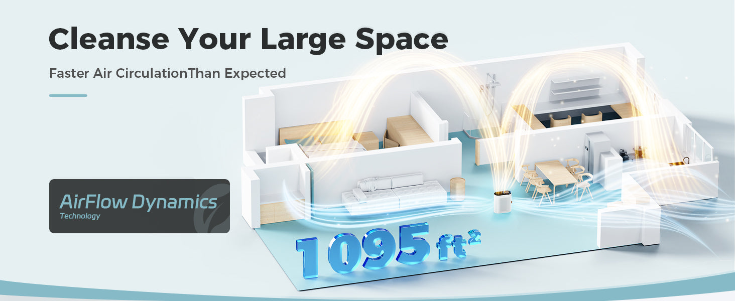 The purifier has a great purification function that can refresh the air per hour in the room up to 1095 sq ft.