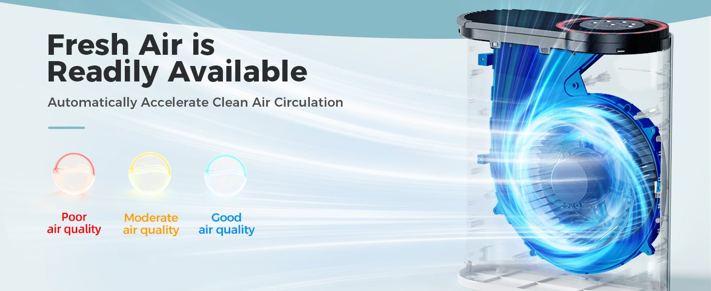 - 【Feel The Air Change】When the air purifier is in auto mode, the air quality indicator will turn yellow or red if the surrounding air becomes cloudy, the fan will speed up to clean the air faster.