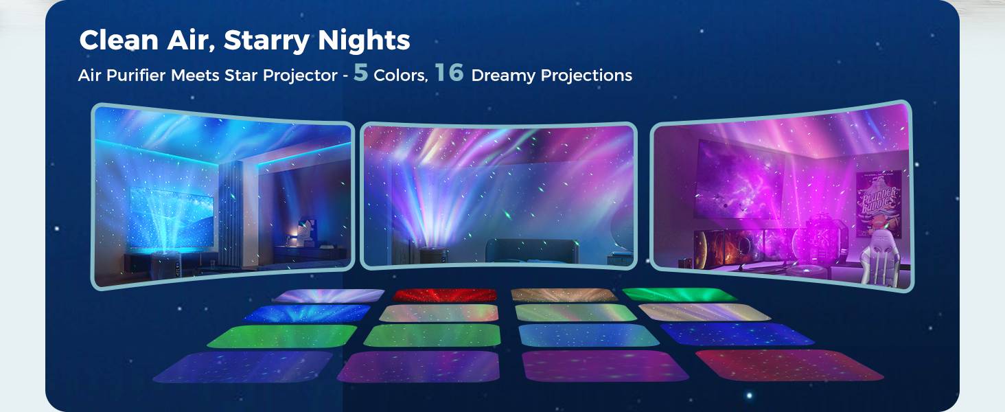 - 【5 Vibrant Colors & 16 Dreamy Effects】The star projector, offering 5 vibrant colors and 16 dreamy effects to immerse you in breathtaking sky wonders. Whether hosting a party at home or setting the mood for a romantic date, this 2-in-1 starry air purifier is your unique choice.