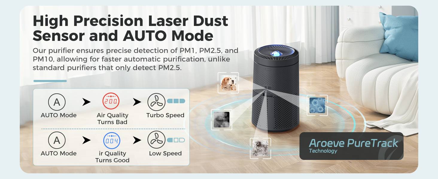 - 【Smart Laser Air Quality Monitor】Accurate laser sensing for real-time visualized air quality monitoring, accurately presenting the air conditions. With intelligent automatic adjustment capabilities, it can automatically regulate based on air quality to achieve smart optimization, ensuring fresh air and making breathing more comfortable.